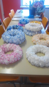 Harrastekerholaisia itse tehdyt, kesäjuhliinkin sopivat kranssit päässä