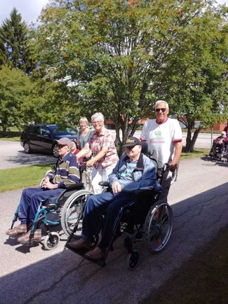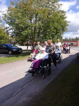 Reippaita vapaaehtoisia Eedilän vanhuksia ulkoluttamassa.